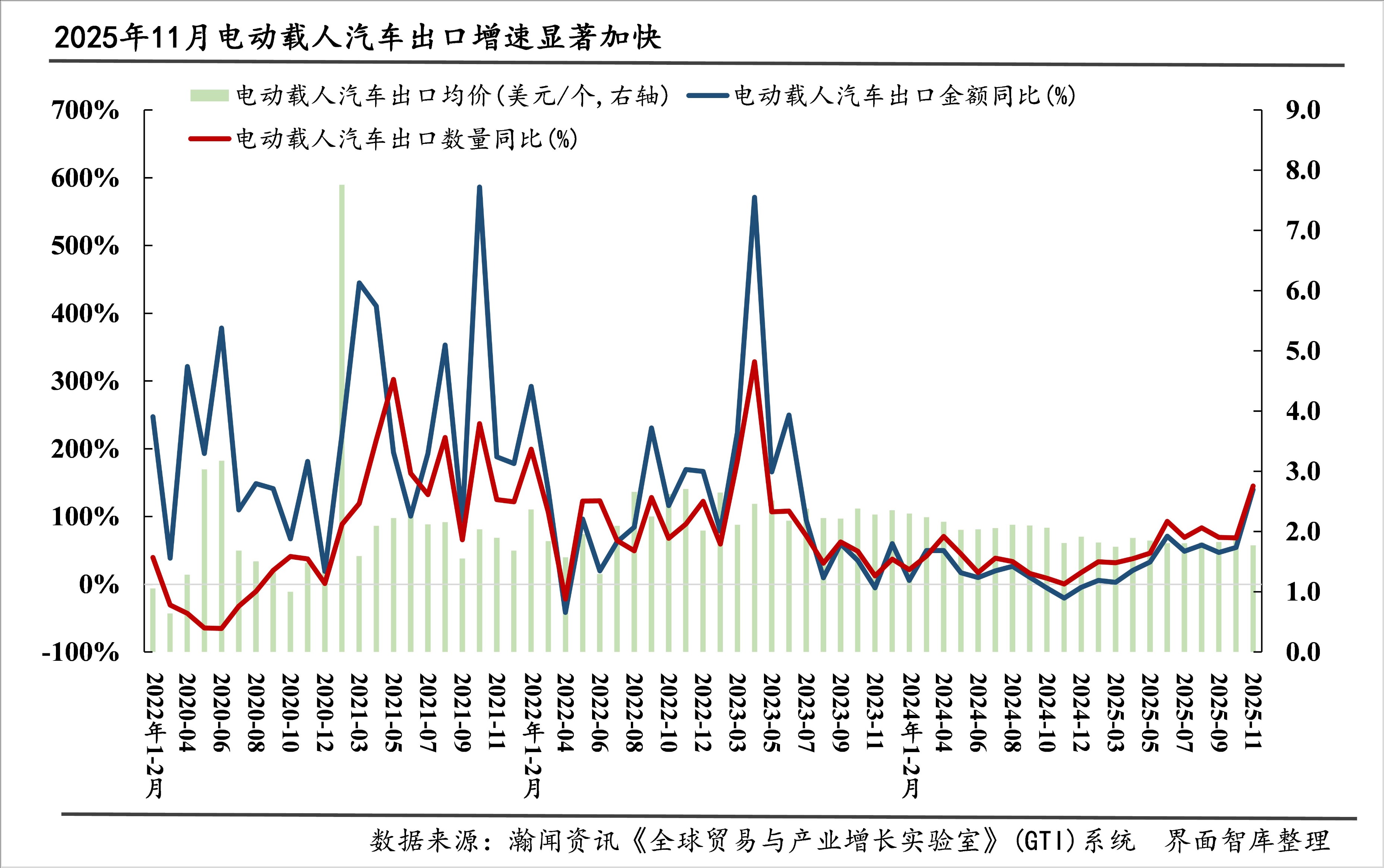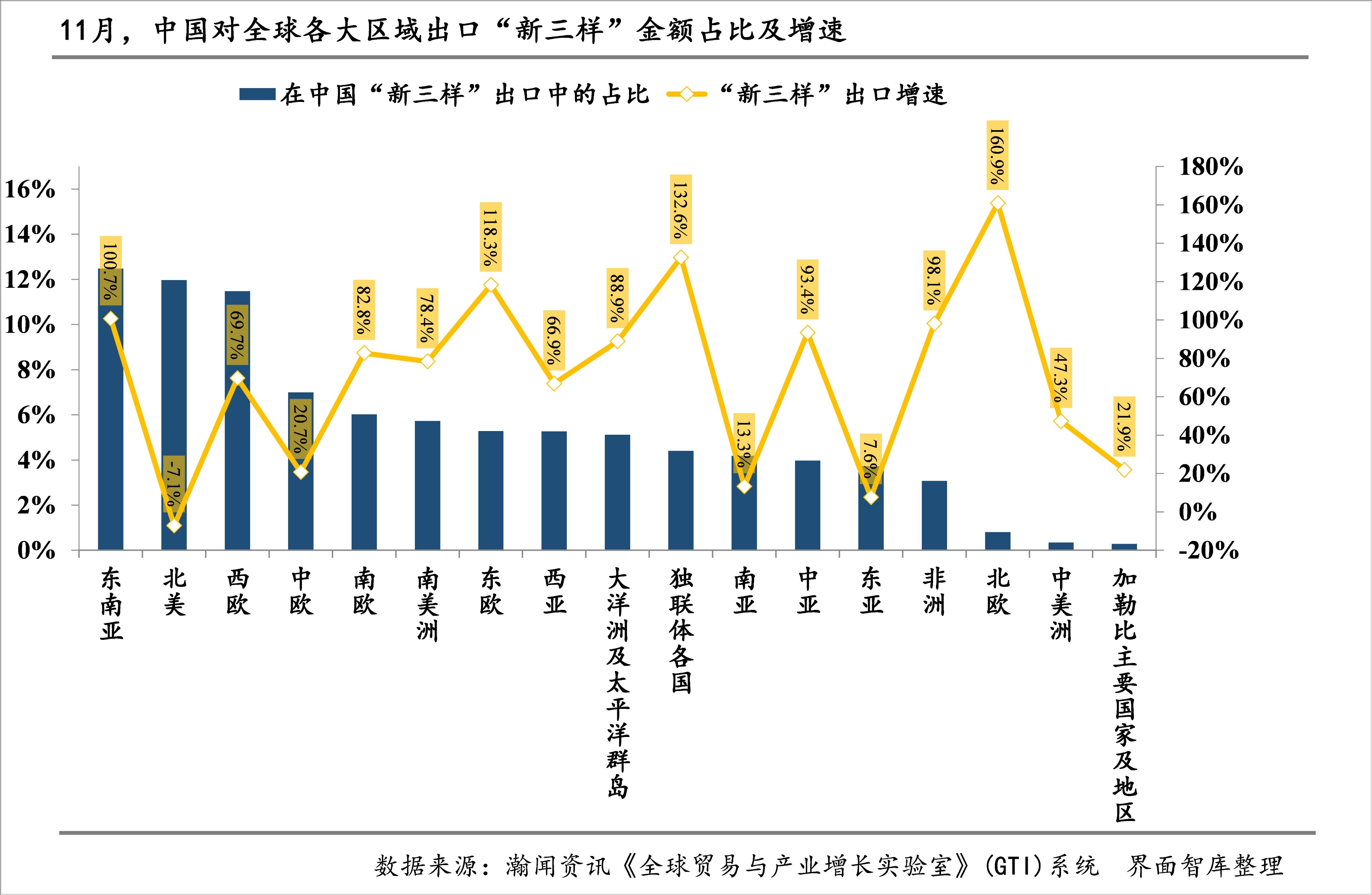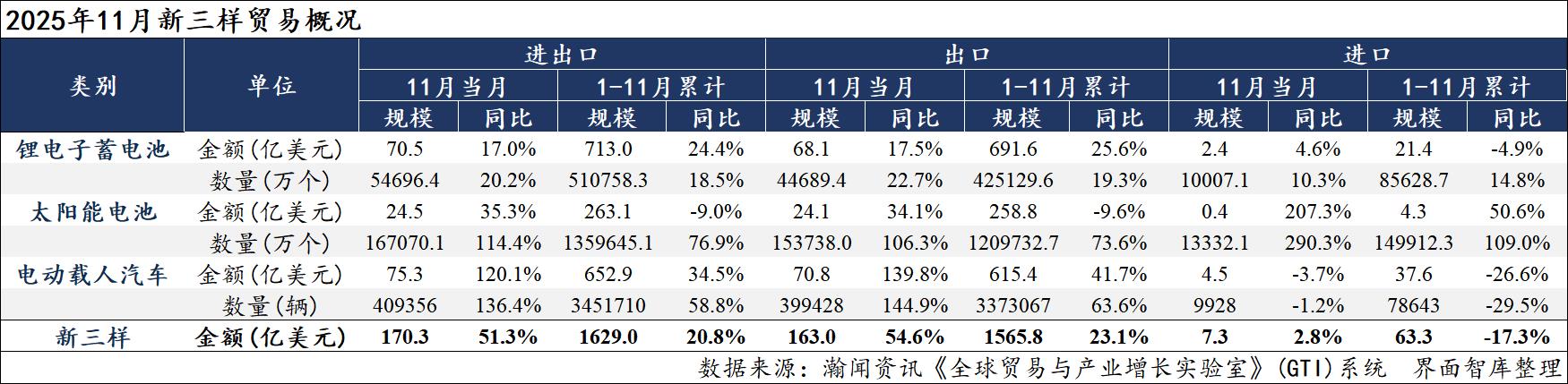 据界面智库和瀚闻资讯统计,2025年1-11月,我国“新三样”进出口总额1629.0亿美元,同比增长20.8%。其中,出口1565.8亿美元,同比增长23.1%;进口63.3亿美元,同比下降17.3%。11月当月,我国“新三样”进出口总额170.3亿美元,环比几乎持平于上月,同比增长51.3%、较上月加快19.6个百分点。其中,出口163.0亿美元,环比下降0.1%,同比增长54.6%、较上月加快22.4个百分点;进口7.3亿美元,环比增长0.5%,同比增长2.8%、较上月下降19.8个百分点。