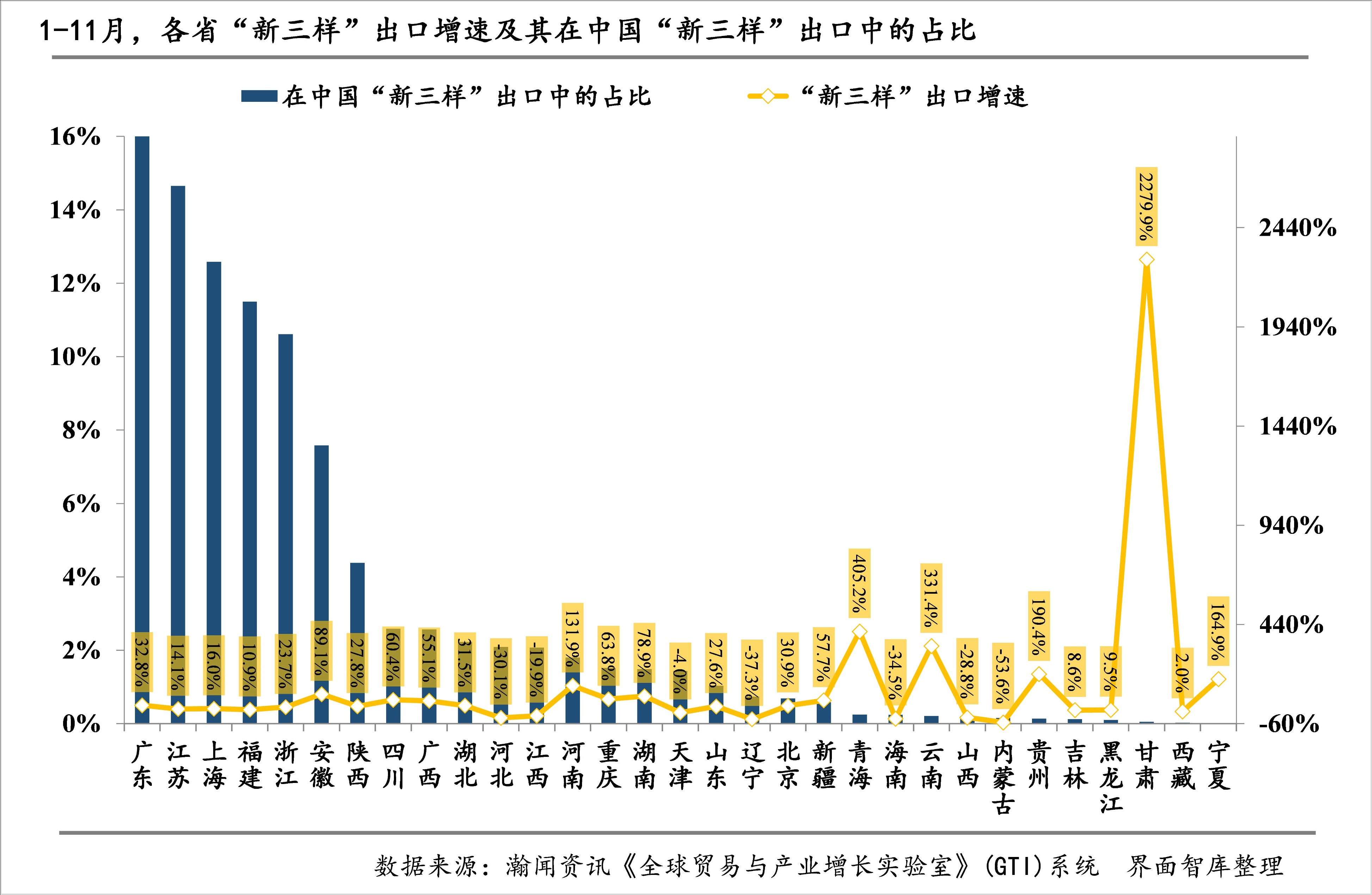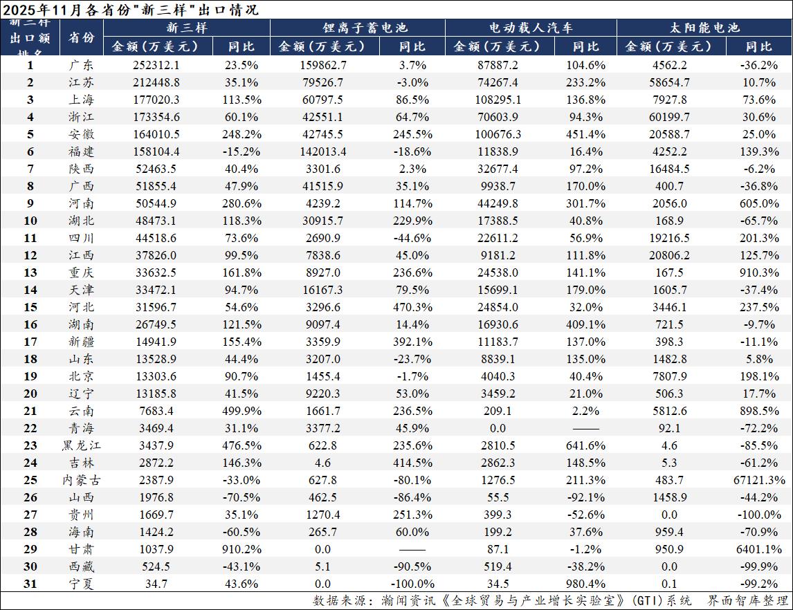 1-11月,全国“新三样”出口规模前十大省份依然是广东、江苏、上海、福建、浙江、安徽、陕西、四川、广西、湖北。与1-10月相比,各省份位次没有发生变化。