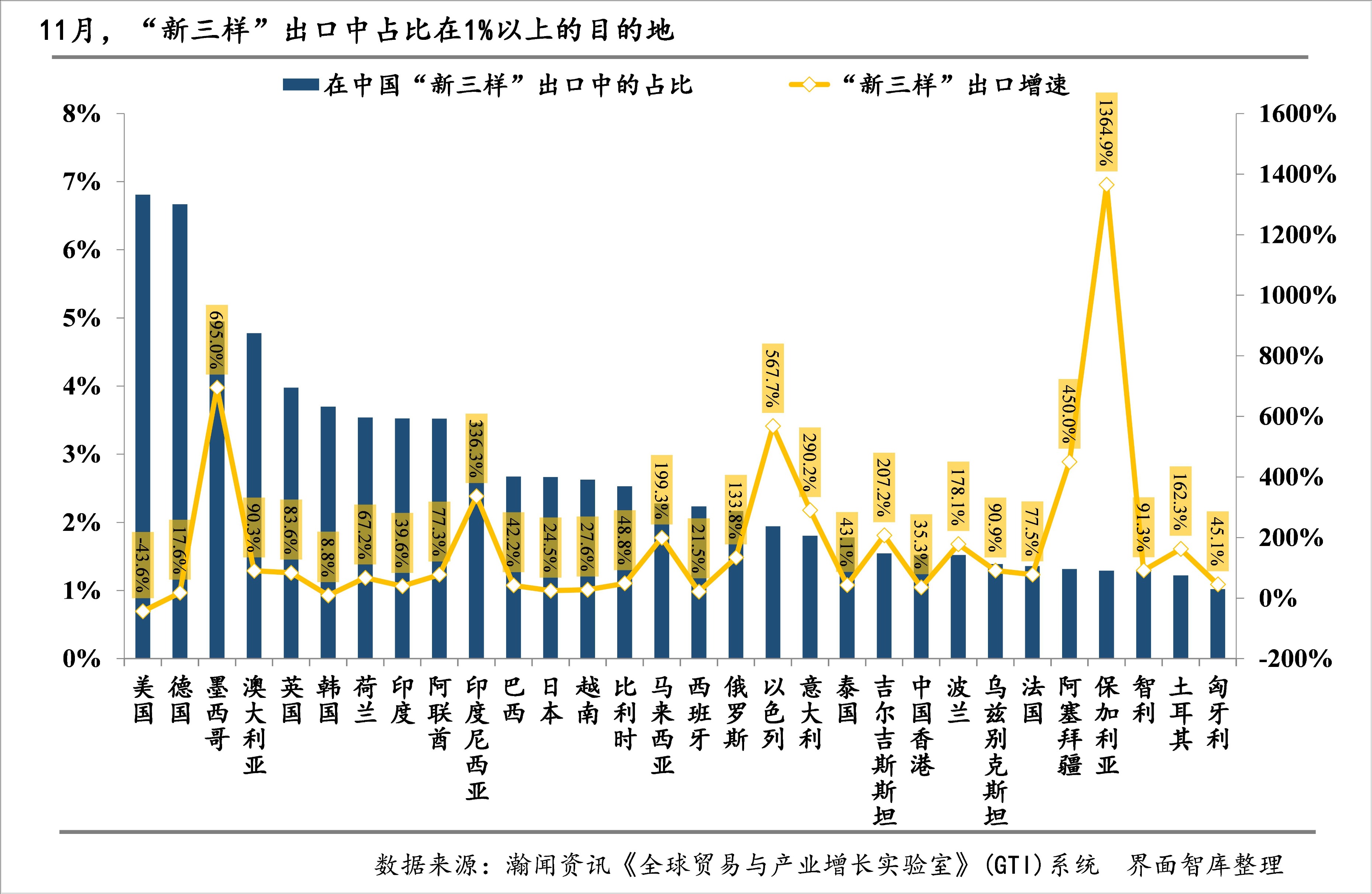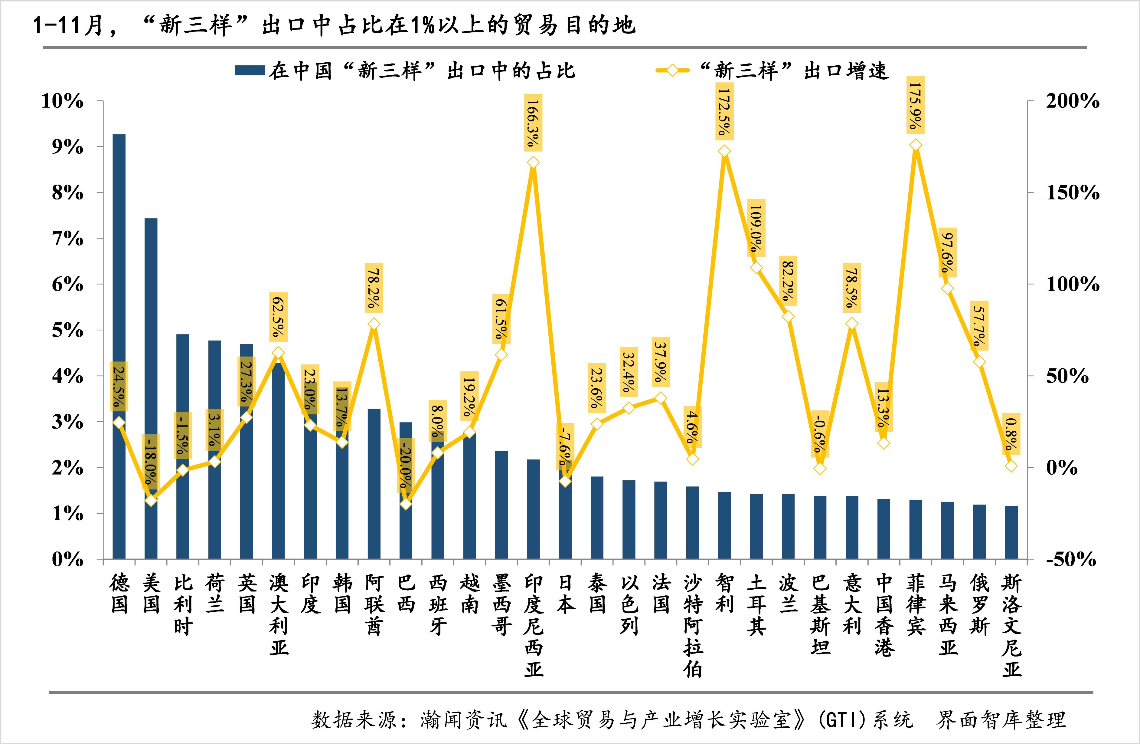 从累计值看,1-11月“新三样”出口中占比在1%以上的目的地仍然为29个。其中,规模最大的十个目的地排位与10月相同。对1-11月“新三样”出口同比增长贡献最大的目的地依次是德国、澳大利亚、阿联酋、印尼、英国、智利、墨西哥、菲律宾,对“新三样”出口同比增长的拉动都在1个百分点以上,其中,德国的贡献依然最大。