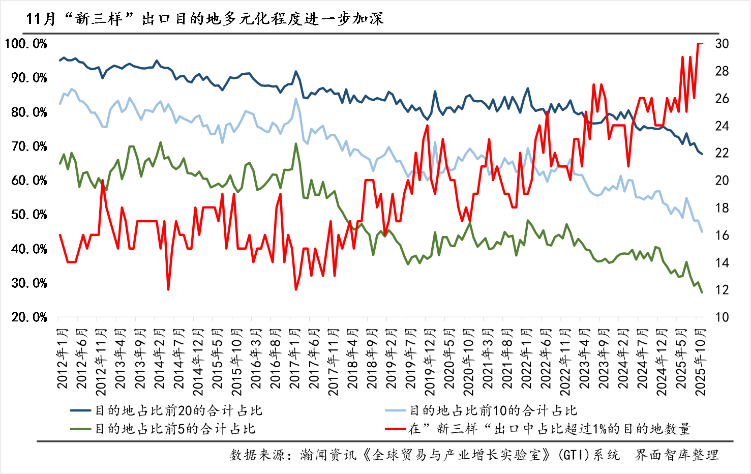 在对美“新三样”出口再次恶化的时候,“新三样”出口多元化程度进一步加深。11月, “新三样”出口前20大目的地合计占比、前10大目的地合计占比、前5大目的地合计占比都创下历史新低,分别为67.6%、44.9%、27.2%,较10月分别下降0.8、3.2、2.9个百分点,较上年同期分别下降7.4、11.7、13.3个百分点。与此同时,占比在1%以上的目的地数量也连续第二个月达到30的历史最高水平,较上年同期增加了6个。