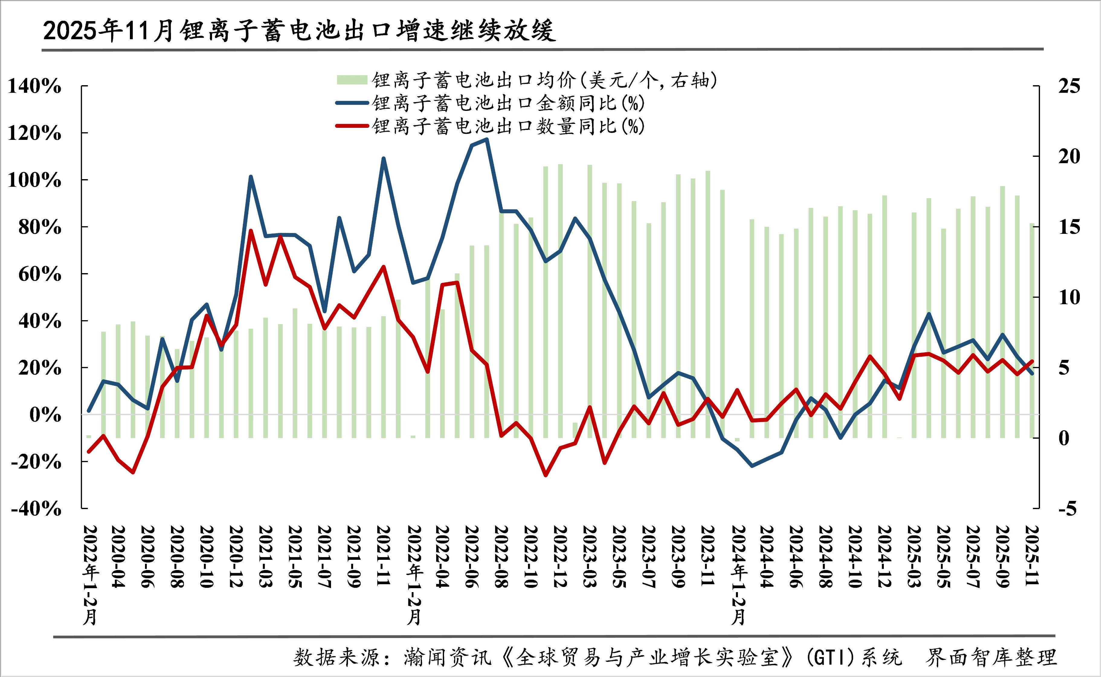锂离子蓄电池出口金额继续放缓。11月,锂离子蓄电池出口数量环比增长10.3%;同比增长22.7%,较10月加速5.5个百分点,较上年同期放缓2.1个百分点;出口均价为15.2美元/个,环比下降11.4%,同比下降4.2%;出口金额为68.1亿美元,环比下降2.3%,同比增长17.5%,较10月放缓7.2个百分点,较上年同期加快12.7个百分点。